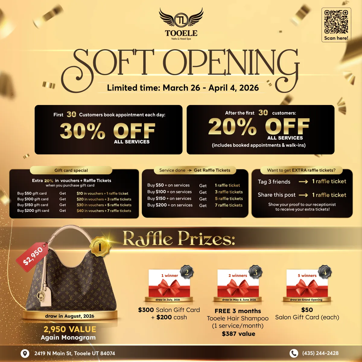 After filling out we will redirect you to our online booking page. Please book an appointment from there. We might need to call to confirm. Offer Soft Opening is only valid if you book an appointment between 3/26 and 4/04/2026.